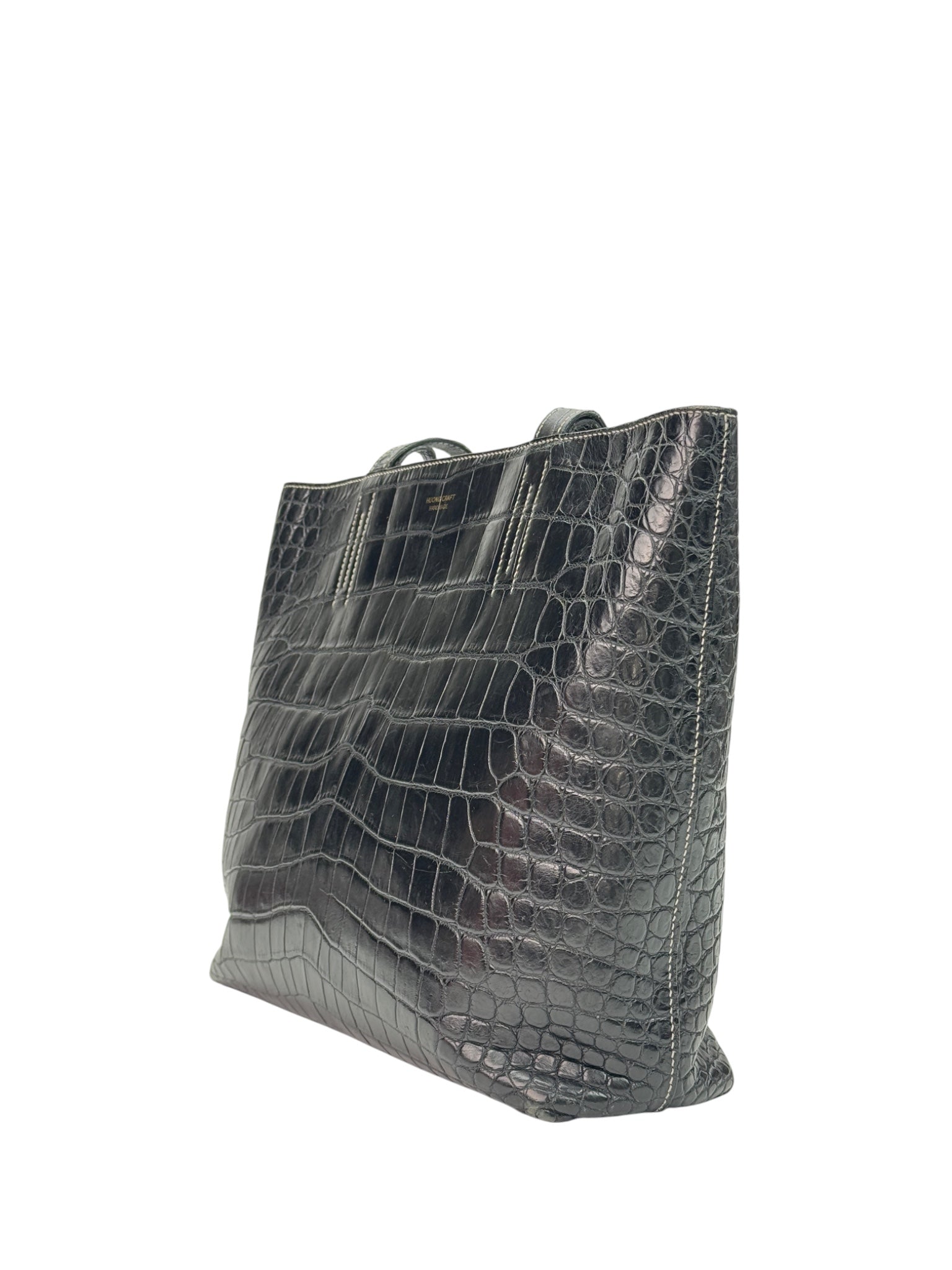 The tote features a horizontal rectangular silhouette with a fully open top. The base is constructed as an integrated flat panel, providing stability when placed down while maintaining a natural drape when carried.